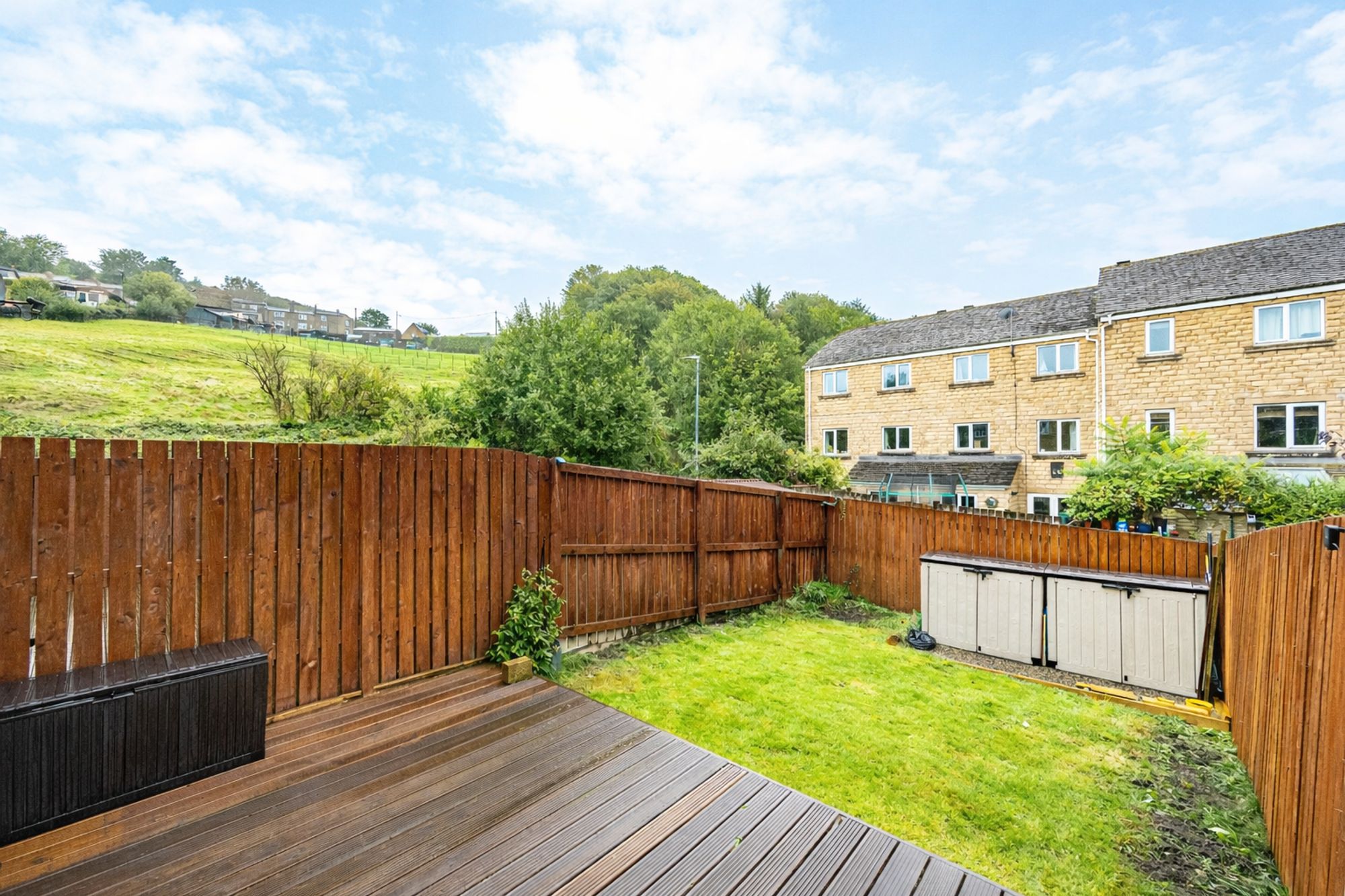 Outside Space - The rear garden offers side views over open fields, featuring a raised decking area for seating and a well-maintained lawn, perfect for relaxing or entertaining.