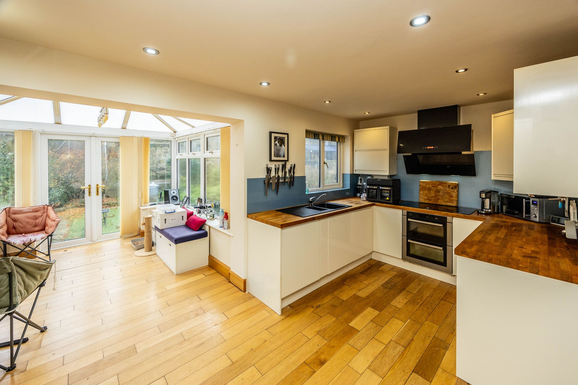 Kitchen 4.95m x 2.68m - Modern kitchen with all you would need in a family home. Gloss base and wall units with handless doors, corner pull out storage carousel. Solid wooden worktop and black sink (bowl and 1/2) with drainer. Glass splashback, electric double oven and grill, 5 ring induction hob with gridle pan options, full size dishwasher, opposite full height fridge, freezer, pantry pull out storage racks.