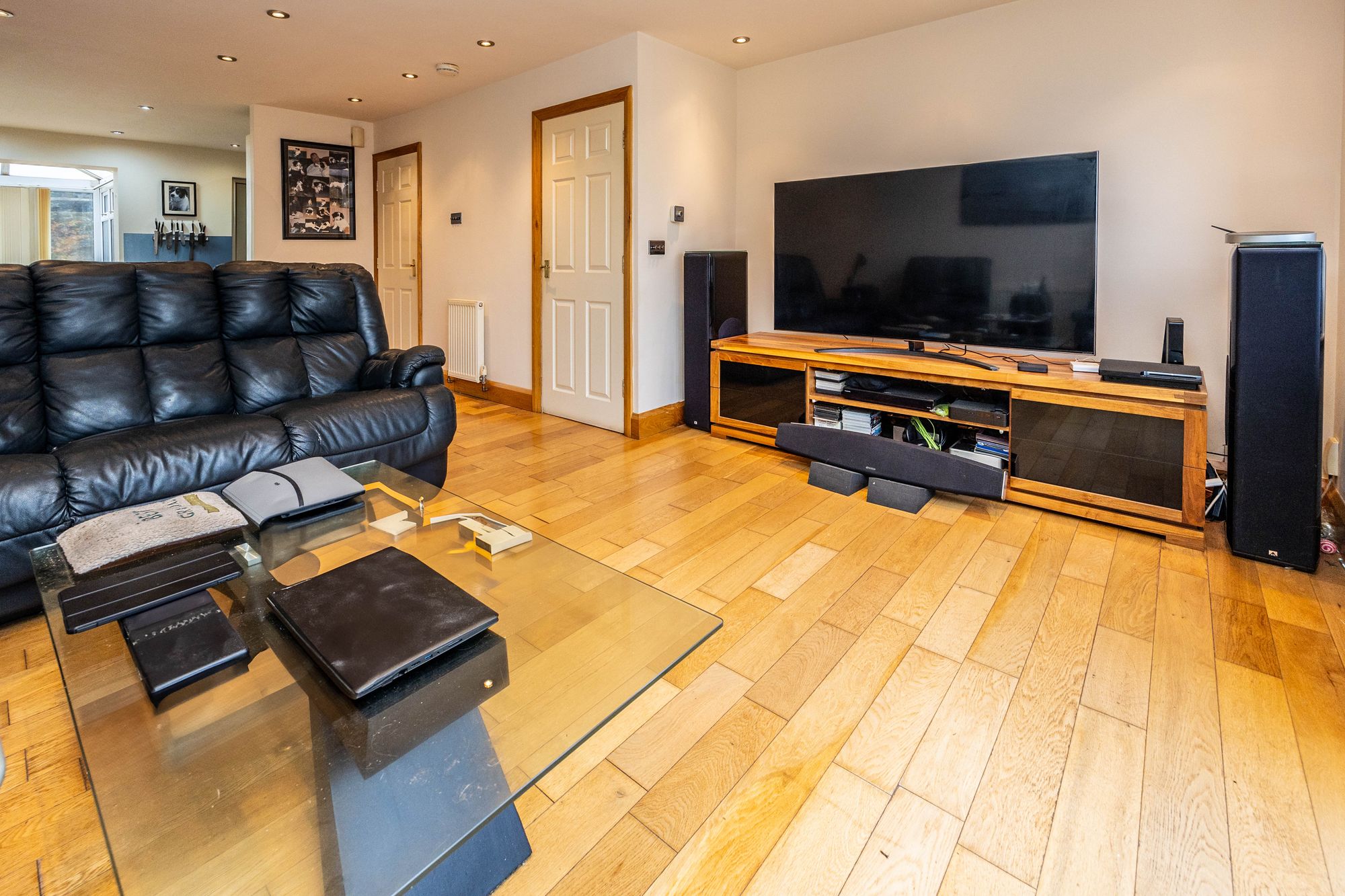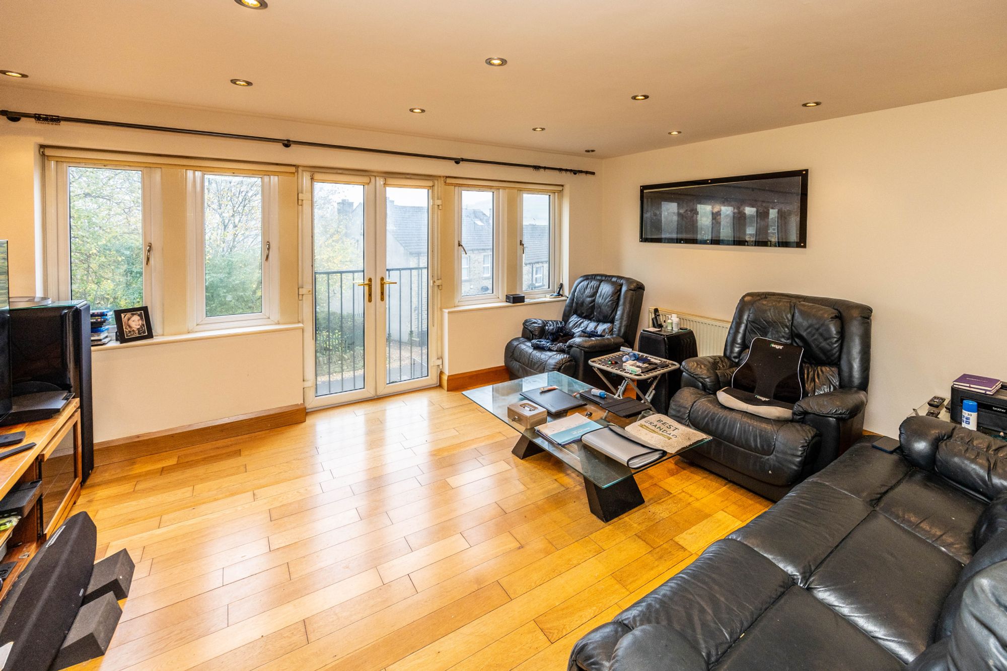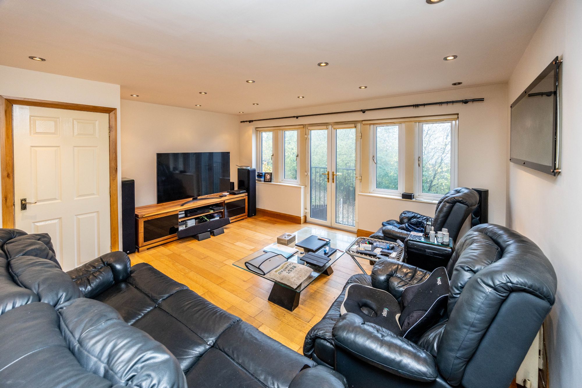 Lounge 3.73m x 4.93m - Hard wood oak flooring throughout. Dimmable multi control downlights. This lounge is spacious with large bank of windows including double doors which open onto a Juliet balcony. Large TV unit included with purchase.