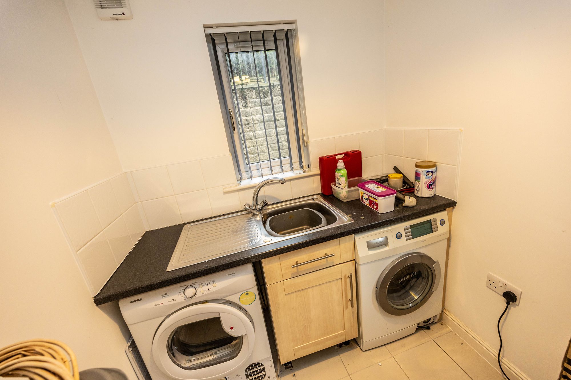 Utility room 2.60m x 1.85m - Side external door access to lower patio area. Washing machine (included), dryer (included) and stainless steel sink and drainer. Additional storage cupboard located under stairs.