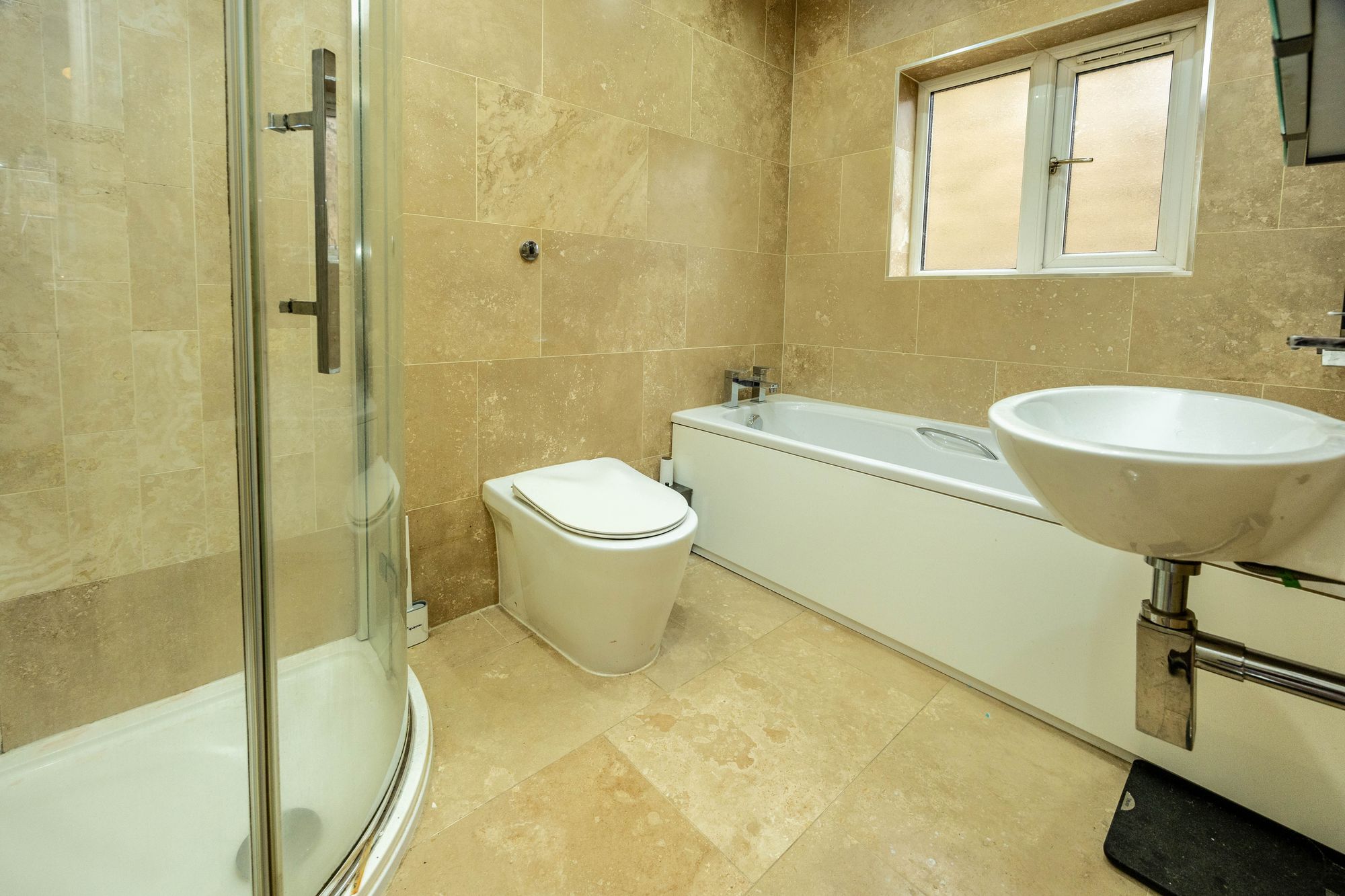Family Bathroom 1.67m x 2.87m - 4 piece suite and fully tiled including underfloor heating. Full size bath, corner shower cubicle, wall hung wash hand basin, and W.C. Black ladder wall hung towel radiator.