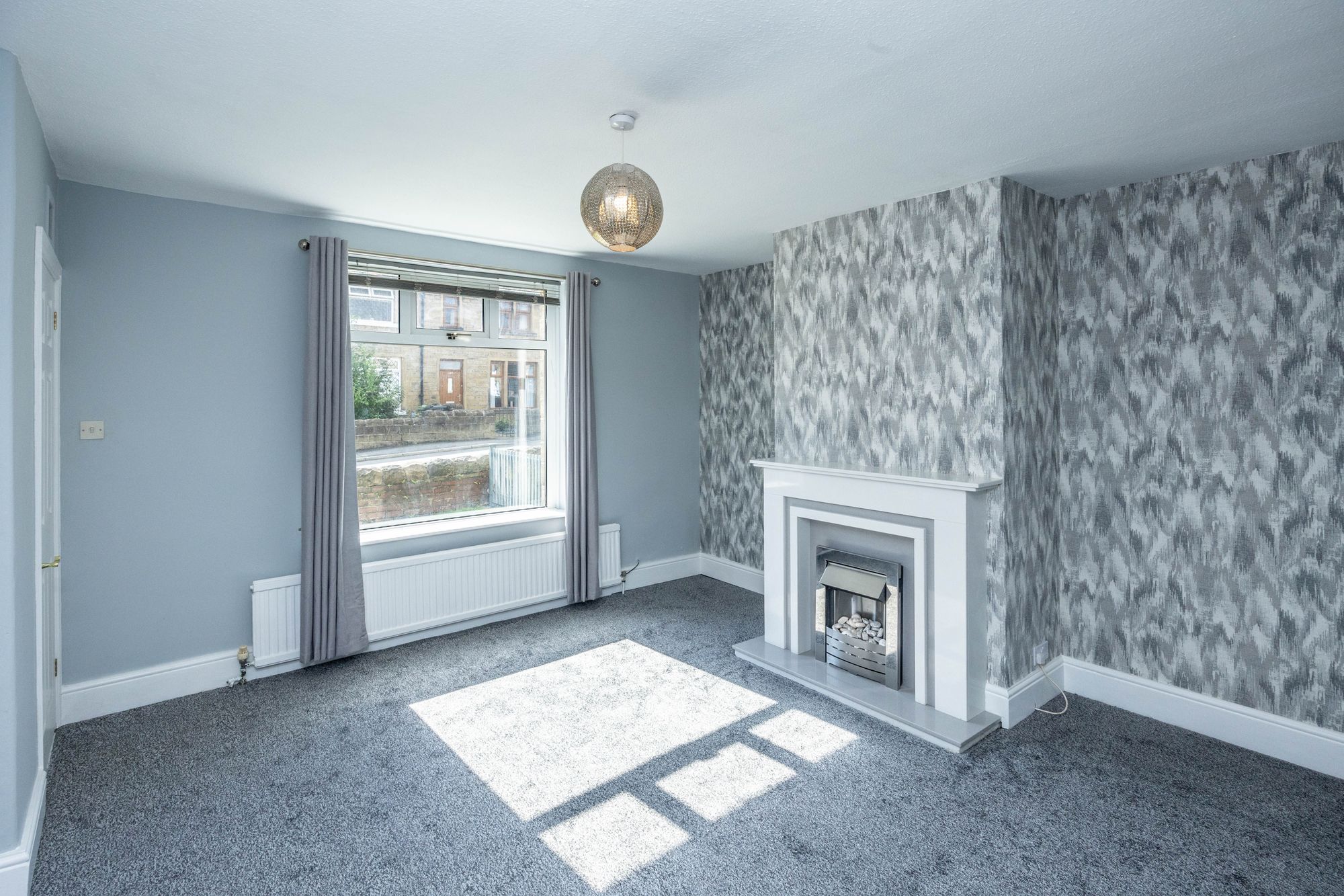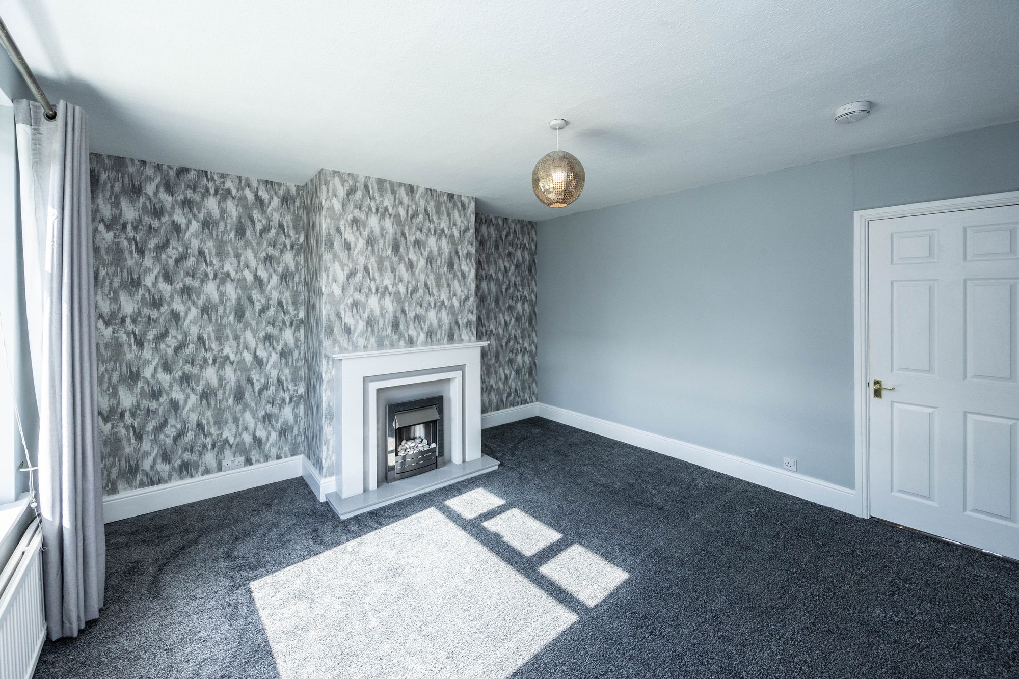 Lounge 4.32m x 4.21m - A generous lounge featuring soft grey carpeting, a sleek modern fireplace, and a striking textured feature wall. Overlooking the front garden, this inviting space is complemented by a large radiator for added warmth.