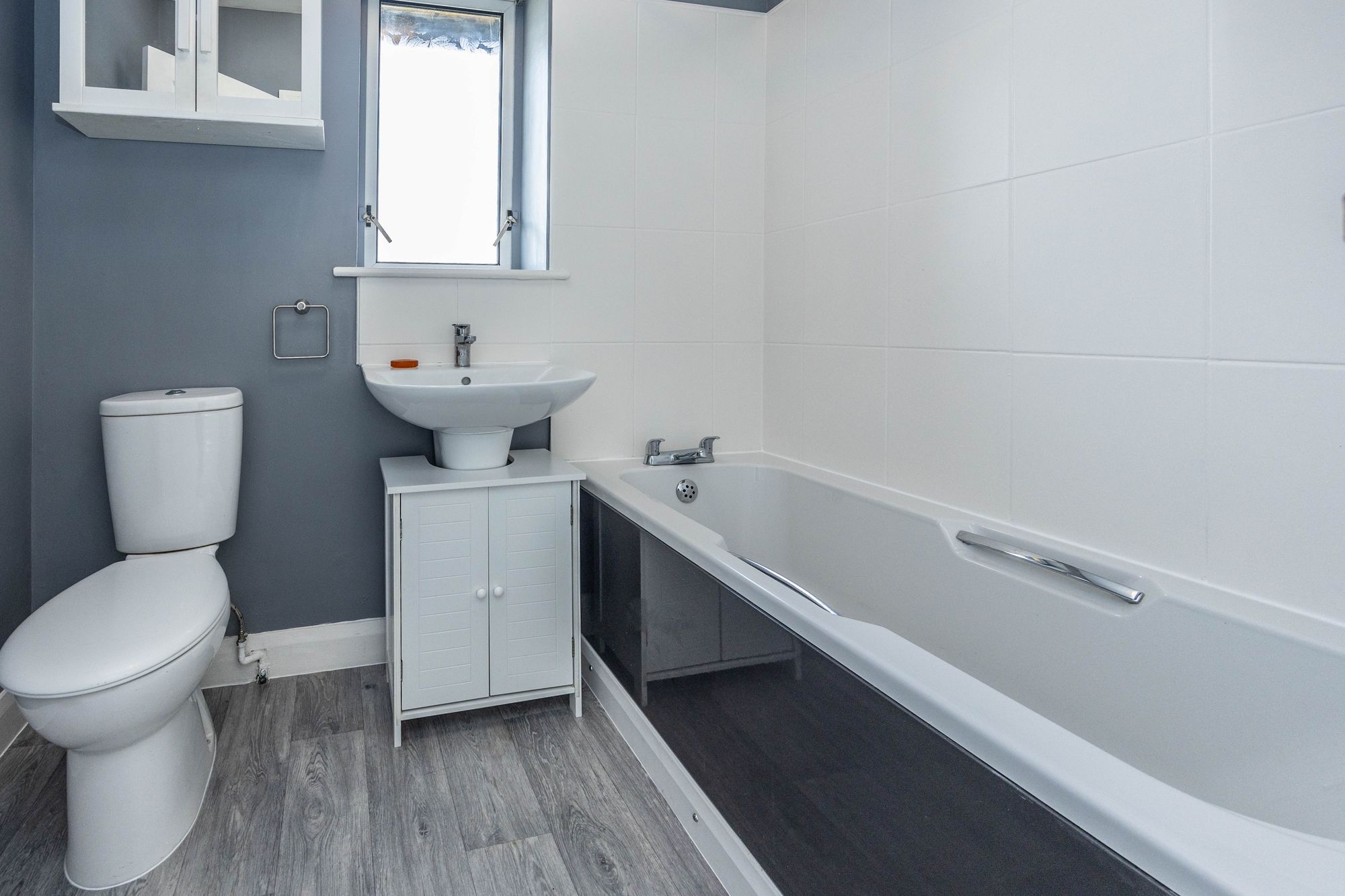 Family Bathroom 2.18m x 1.57m - A well-appointed bathroom featuring a fitted bath, wash basin with handy under-sink storage, and a low-flush WC. Finished with wood-effect laminate flooring and a privacy-glass window for natural light.
