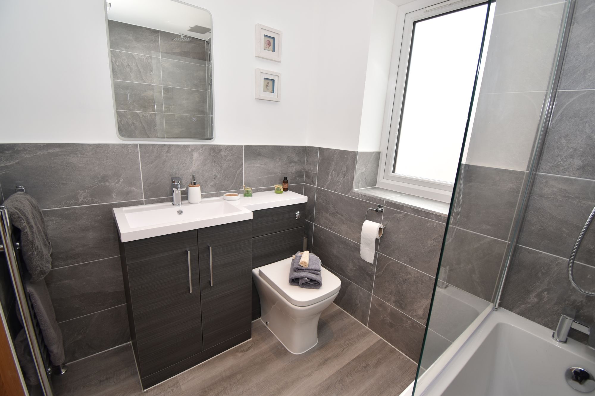 Family Bathroom - A modern bathroom featuring semi-tiled walls and a frosted window. Three-piece suite with panelled bath, complete with tap and shower attachment, glass shower screen, wash hand basin with mixer tap and low flush WC. Additional features include a heated towel rail and ceiling spotlights.