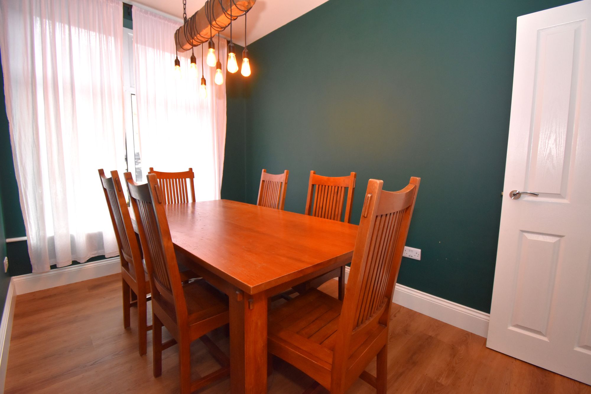 Dining 3.58m x 2.36m - Space for a large table and a continuation of the flooring from the hallway, spotlights and curtains.