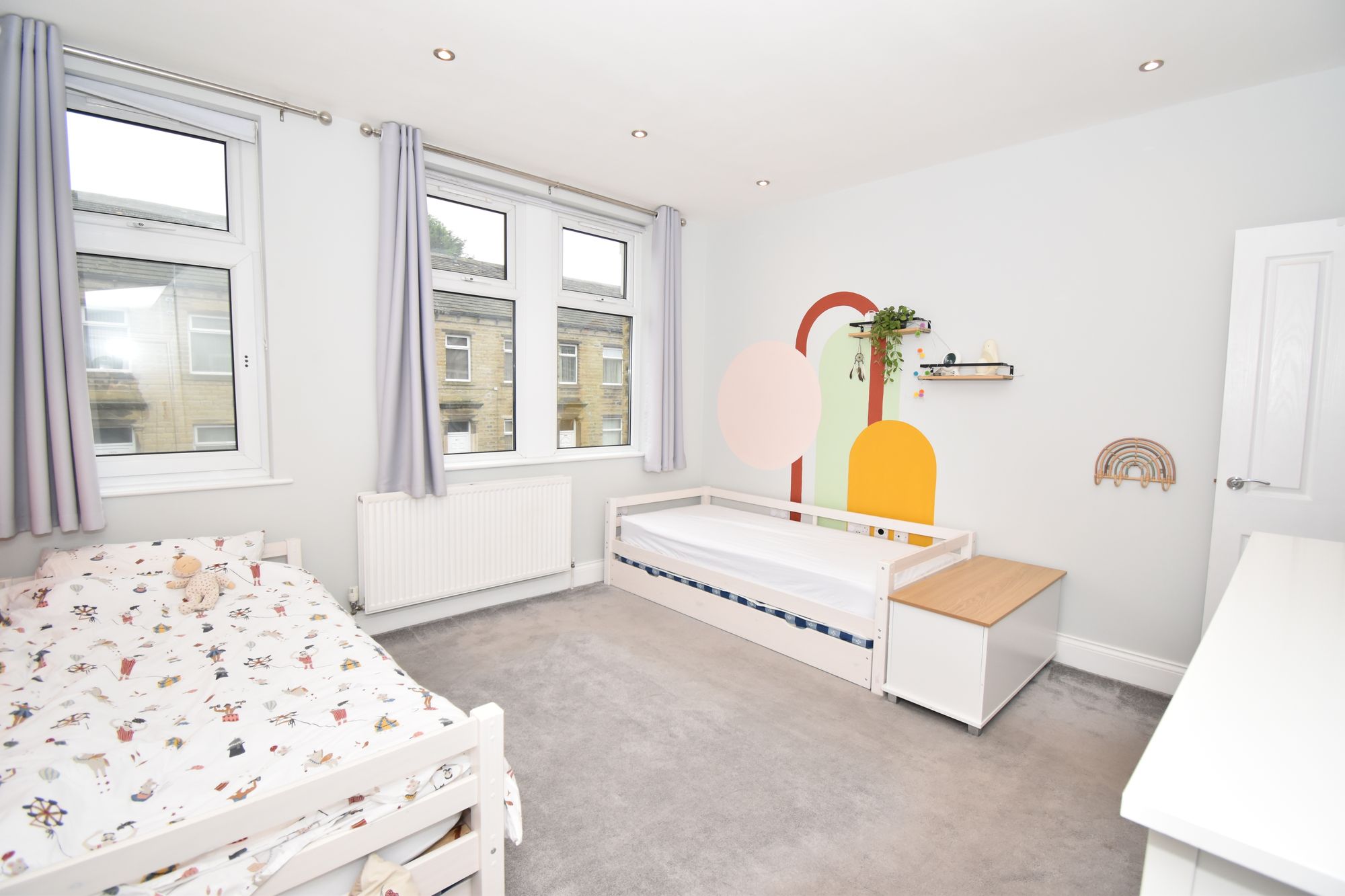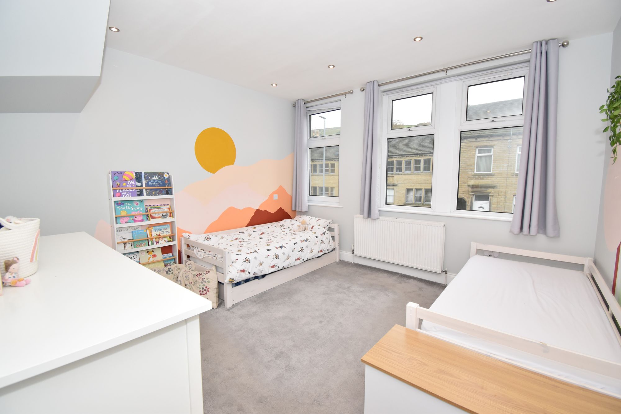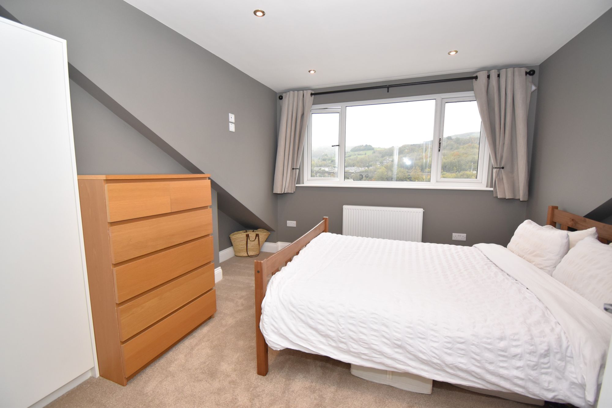 Master bedroom (rear) 3.75m x 3.42m - The best views of the Colne Valley and Slaithwaite can be enjoyed from the bed of this room with large dorma window, fitted wardrobes and curtains, radiator and carpeted flooring.