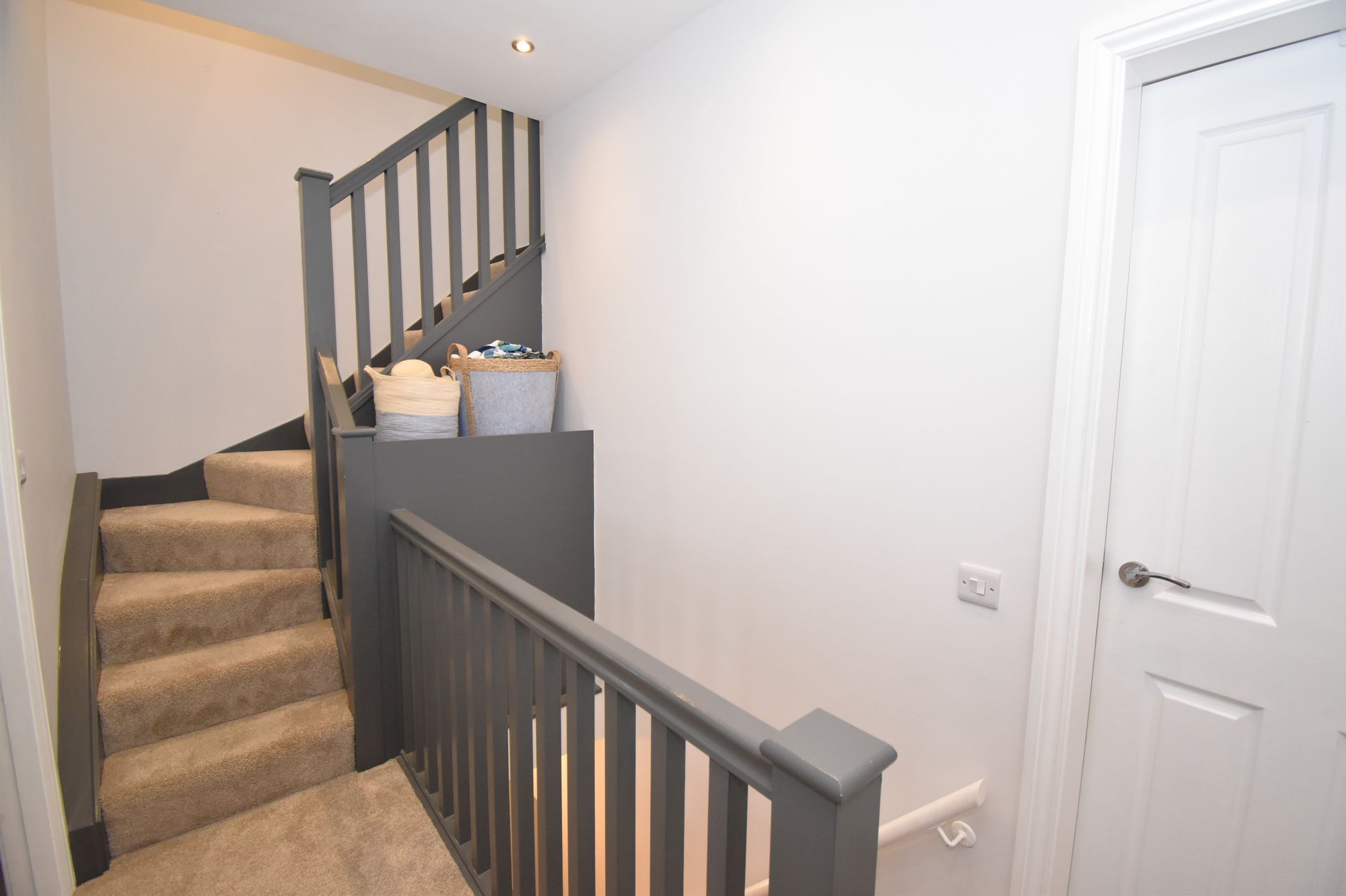 Landing 3.82m x 1.72m - Bright spacious landing with vanity storage cupboard along with power sockets for charging. Washing basket shelf and stairs leading to master suite on the second floor.