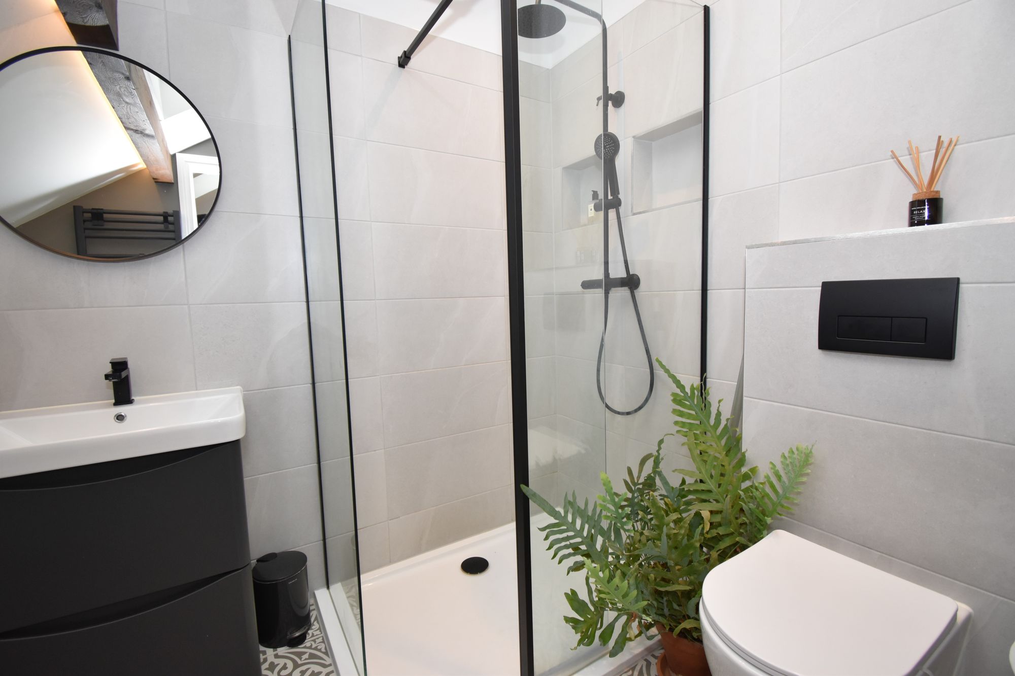 Shower room 1.66m x 2.81m - Ultra modern with an exceptional finish this area is fully tiled, spotlights, ceiling extractor fan, shower with rainfall option, glass screen, towel radiator, large sink with mixer tap and double drawers for vanity storage and wall mounted mirror.