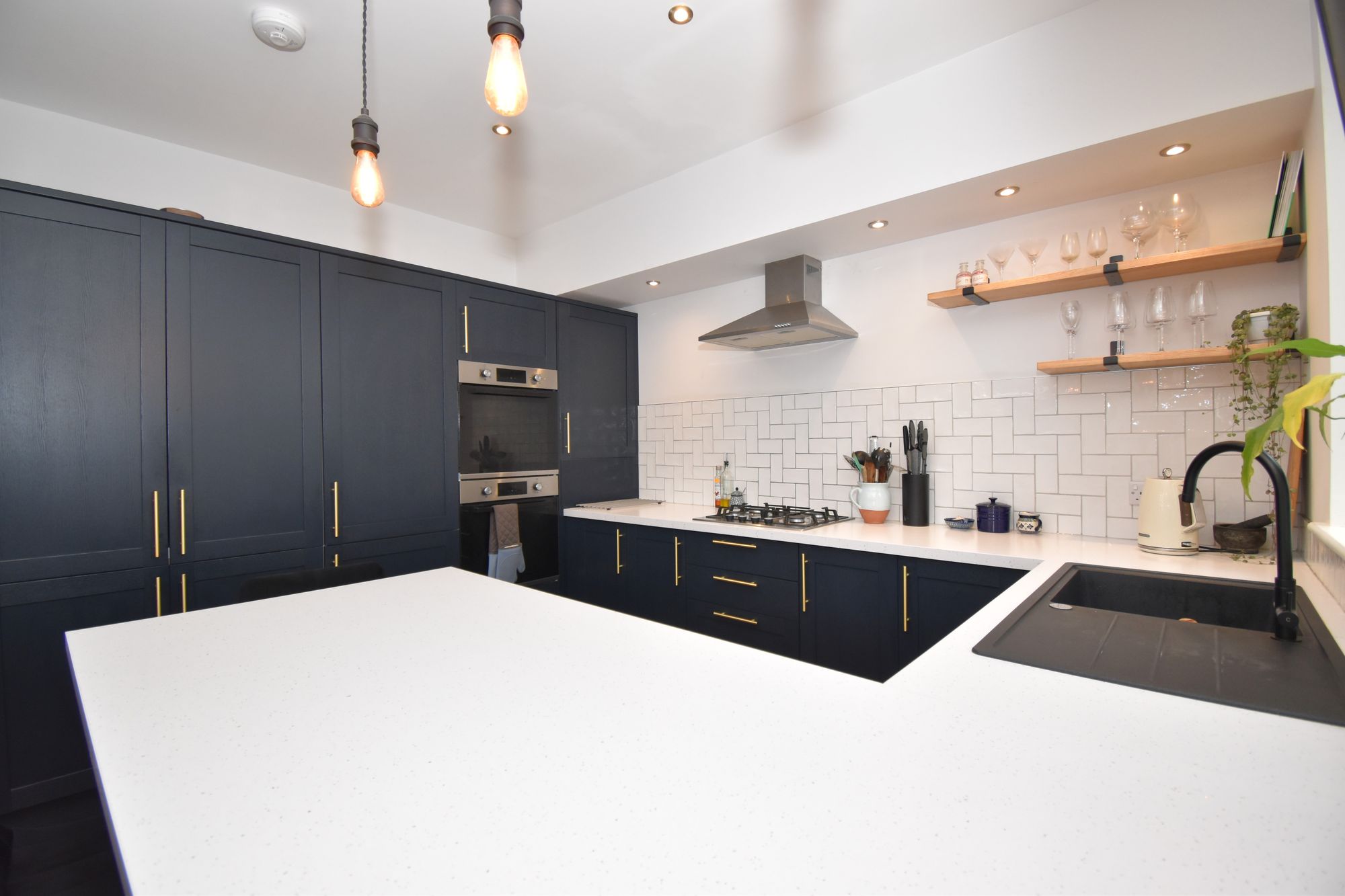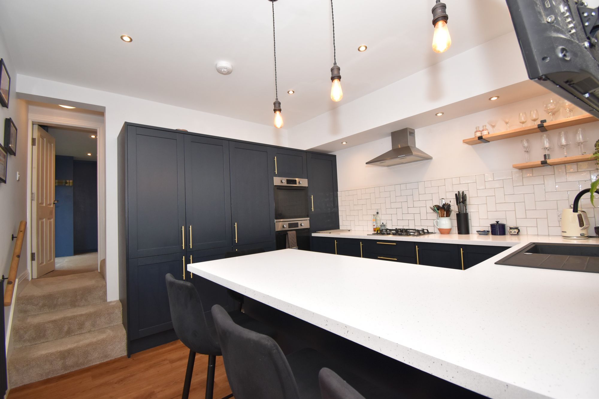 Kitchen / Dining 3.67m x 3.75m - Contemporary kitchen with 4-seater breakfast bar with seating. Granite effect worktop and wood effect flooring compliment the navy-blue wall and base units. Hidden breakfast/coffee station along with integrated appliances including fridge freezer, dishwasher and double electric oven makes the kitchen full of all the essentials! Sink and drainer and 4 ring gas hob with overhead extractor finish off the area below a brick effect tiled splashback. Feature lighting (dimmable) over the breakfast bar and spotlights in the ceiling. And if that wasn't enough a TV wall mounted over the bar area for those evenings of entertainment.