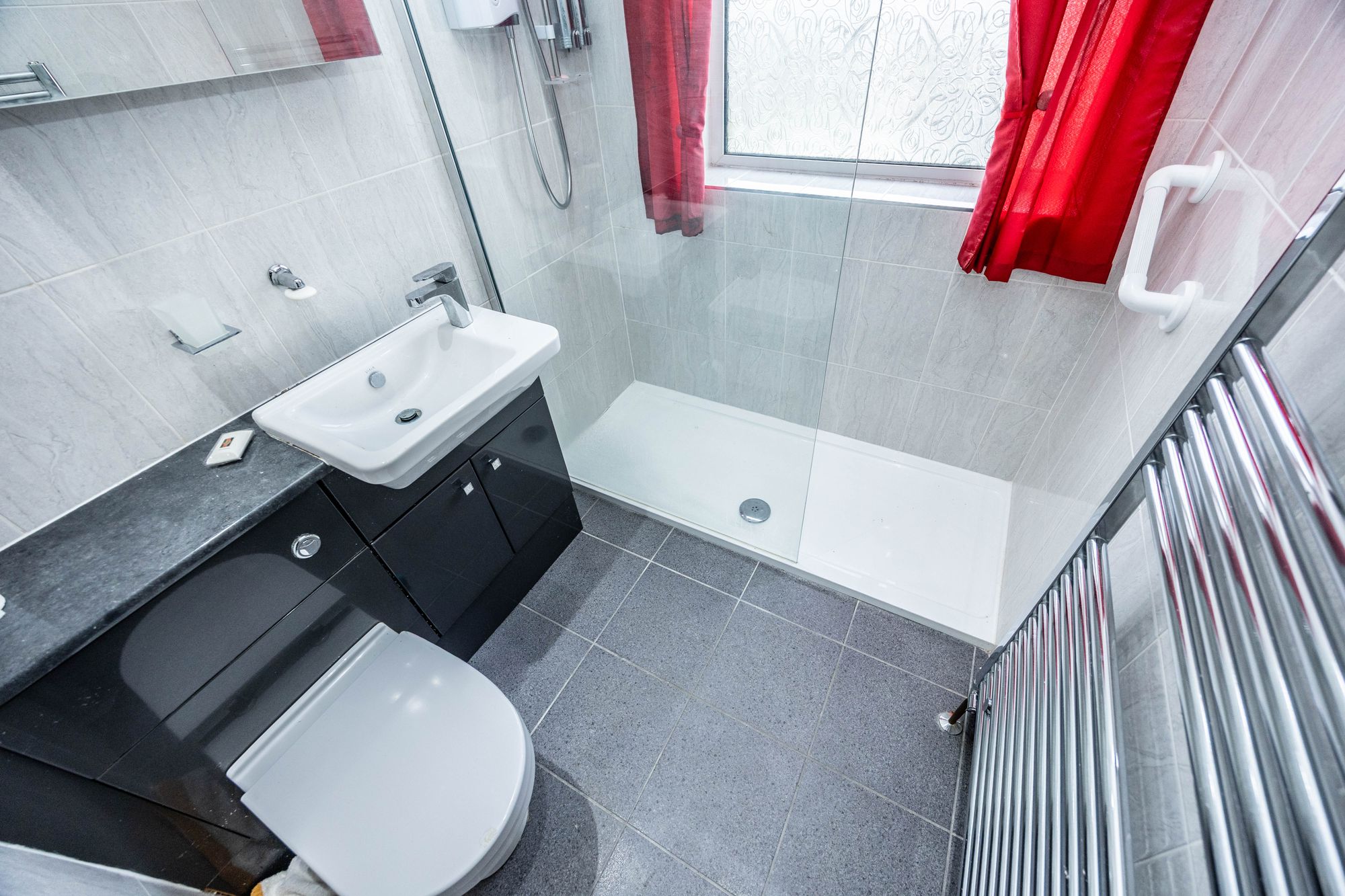 Family Bathroom 2.07m x 1.72m – Modern shower room finished with contemporary tiling, featuring a walk-in shower, vanity unit with basin, WC, heated towel rail, and a frosted window providing natural light and privacy.
