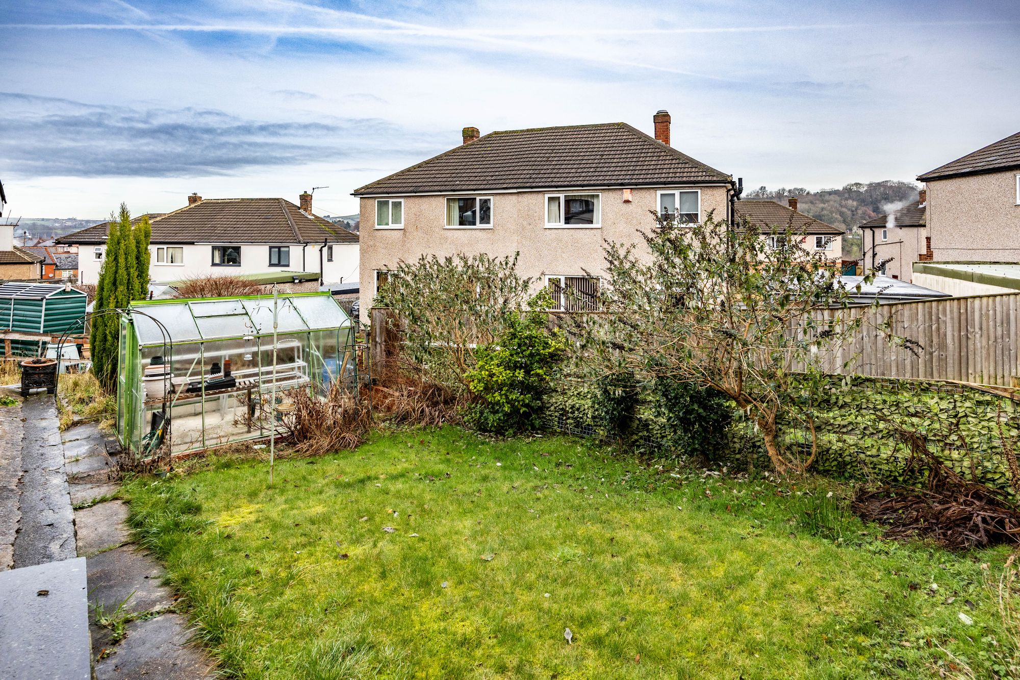 Outside Space – Gardens to the front and rear, with the rear garden featuring raised patio areas, planters, and lawn, leading to a convenient greenhouse and shed. The space offers excellent potential for renovation or further landscaping.