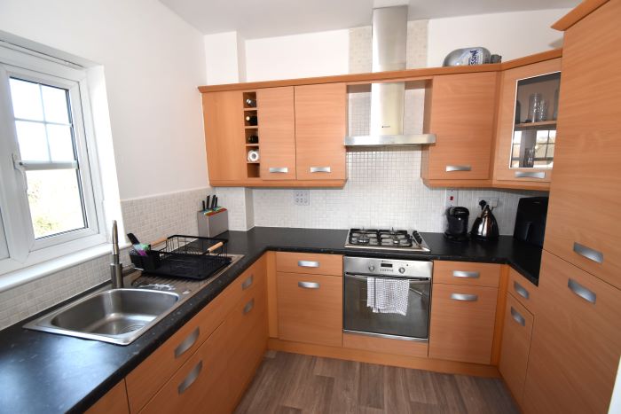 Kitchen - The modern kitchen features a variety of wall and base units, complemented by a tiled splashback and laminate effect flooring. Integrated appliances include an electric oven, four-ring gas hob, extractor fan, fridge-freezer, dishwasher, washer-dryer, and a sink with a drainage board. A window overlooking the side aspect adds natural light.