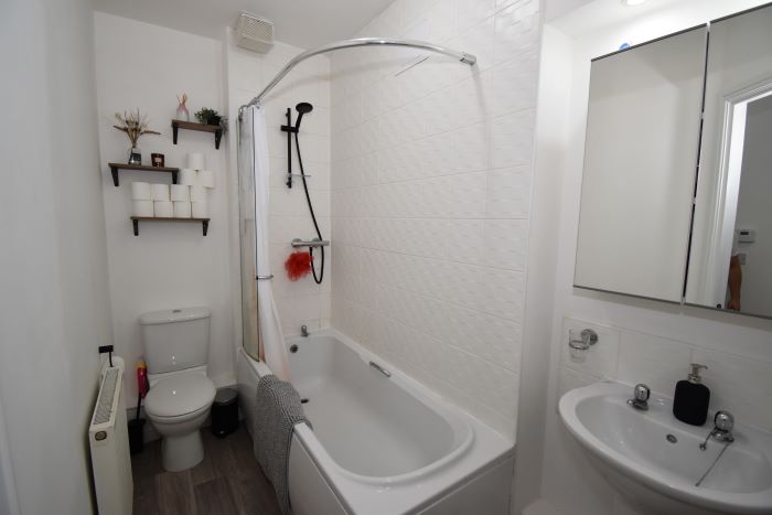 Bathroom - The well-sized bathroom includes a full-sized bath with taps, an overhead shower with thermostatic mixer, a glass shower screen, and a curtain rail. It also features a low-flush WC, washbasin with overhead storage, white tiled splashback, radiator, extractor fan, wall-mounted towel holder, toilet roll holder, and toothbrush holder. Laminate effect flooring throughout.