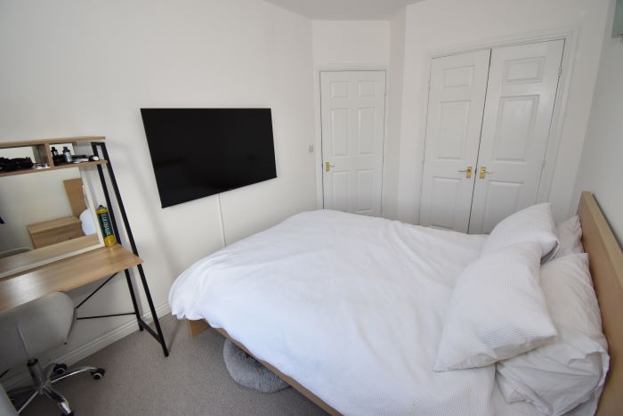 Bedroom 1 - A spacious double bedroom featuring fitted wardrobes, a radiator, and carpeted flooring, with windows on the side elevation that allow plenty of natural light, inclusive of all curtains and blinds.