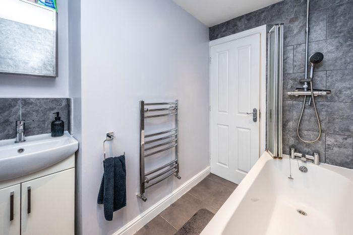 Family Bathroom 2.29m x 1.53m - Stylishly presented family bathroom featuring contemporary grey wall and floor tiles for a sleek, modern look. The suite includes a full-sized bathtub, low flush WC, wash basin with under-sink storage, and a chrome heated towel rail for added comfort and practicality.