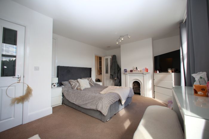 Bedroom 1 (Front) - Spacious front-facing bedroom, fully carpeted, featuring a radiator and a decorative fireplace.