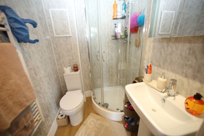 Bathroom - Modern 3-piece suite and marble effect wall panelling. Radiator and extractor fan.