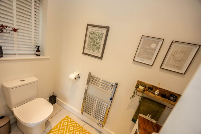 W.C 2.17m x 1.06m – Spacious WC fitted with a low flush W.C. and a wash basin set on a stylish wall-mounted wooden vanity unit. Featuring neutral walls, complementary tiled flooring and splashback, inset spotlights, extractor fan, and a frosted side window for added privacy. A chrome towel warmer and a co-ordinating wooden-framed mirror complete this well-designed space.