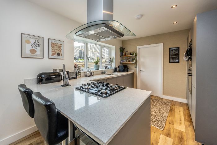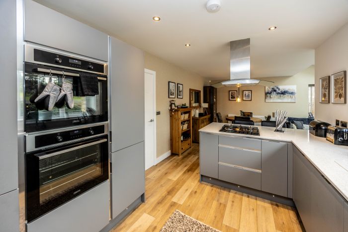 Kitchen 3.82m x 2.97m – This modern kitchen is beautifully designed with sleek grey cabinetry, integrated appliances, and high-quality Silestone worktops which extend to the breakfast bar. The central island includes a modern gas hob with a striking overhead extractor, offering a practical and stylish cooking space. The kitchen flows effortlessly into the dining area, offering delightful views over the stunning rear garden. Wood-effect flooring extends seamlessly through to the reception room, creating a natural look.