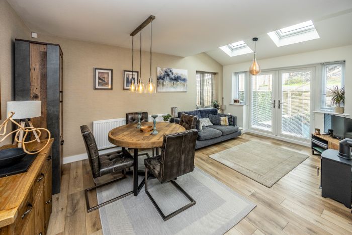 Dining Room 5.38m x 3.48m – This bright and stylish dining area features beautiful wood-look flooring and is enhanced by natural light from overhead skylights, two velux roof windows and large patio doors. Neutral-toned walls provide a modern, versatile backdrop, while recessed radiators maintain a sleek, uncluttered aesthetic. Perfectly positioned within an open-plan layout, this space offers a seamless flow ideal for both everyday living and entertaining.