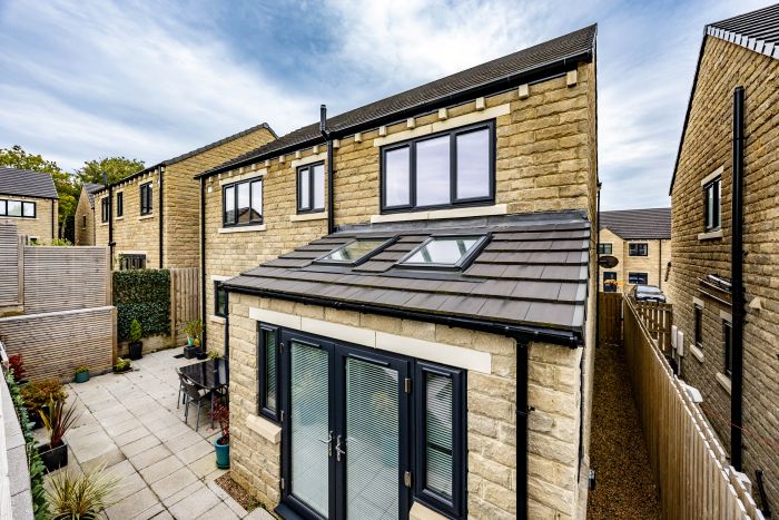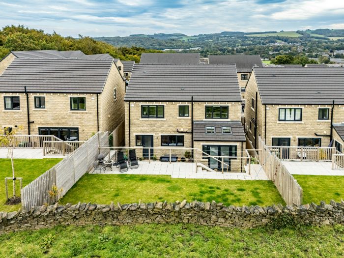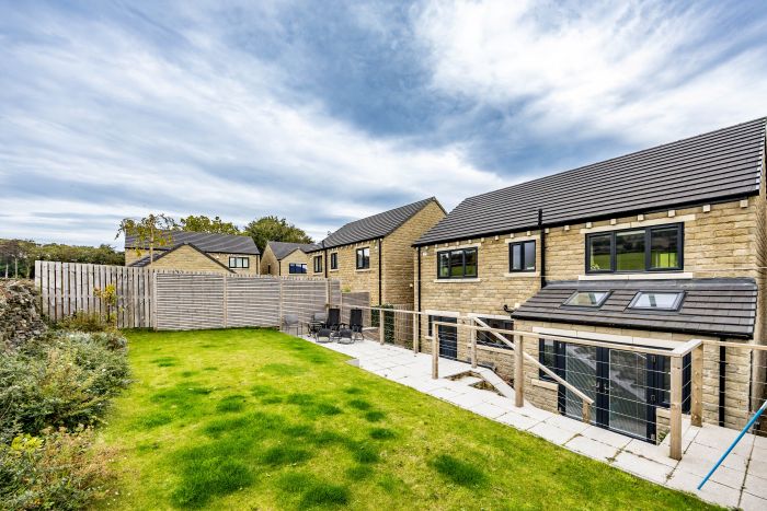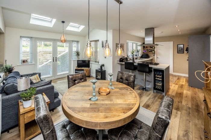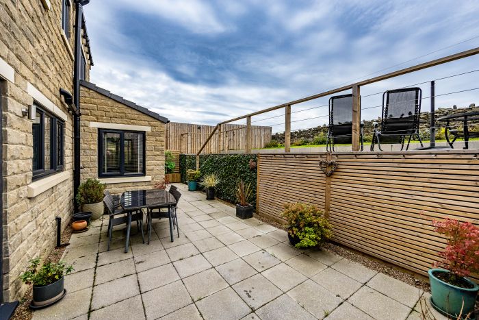 Outside Space – To the front of the property is a charming garden area with established shrubbery, adding kerb appeal. To the rear, a generously sized, elevated garden is arranged over two levels. A raised patio provides the perfect spot to enjoy scenic views across the garden and surrounding countryside, ideal for entertaining or keeping an eye on children at play. Directly outside the French doors, another patio area creates a seamless extension of the open-plan kitchen/diner, perfect for sunny days. Below, a well-maintained lawn is bordered by a traditional drystone wall, offering a natural divide between the garden and the adjoining agricultural fields.
