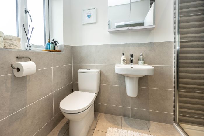 Family Bathroom 2.97m x 2.09m – Stylish family bathroom featuring matching tiling to the en-suite, with easy-clean floor tiles and a modern three-piece suite comprising a low-flush WC, bathtub, wall-mounted sink, and a spacious walk-in shower. Finished with overhead spotlights and built-in chrome cabinet, perfect for towel storage.