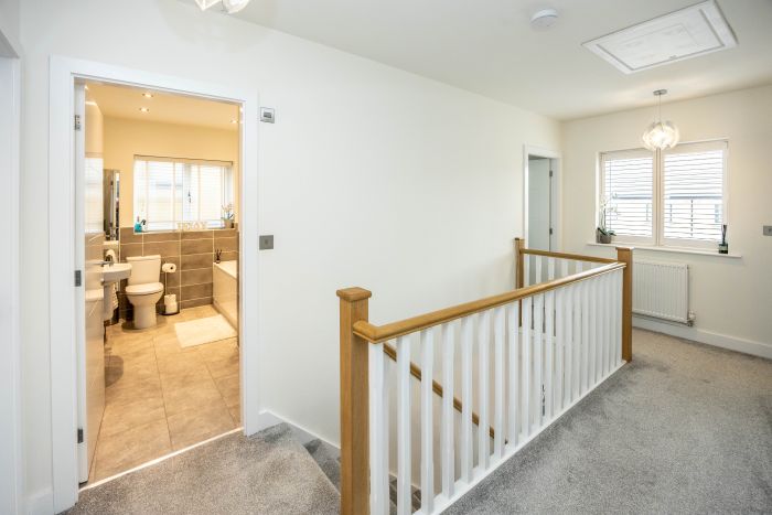 Landing 4.84m x 2.61m – Carpeted landing with useful storage space for bedding and towels, complemented by a beautiful wooden banister. Provides access to all bedrooms and the family bathroom, with the en-suite accessed via the master bedroom.