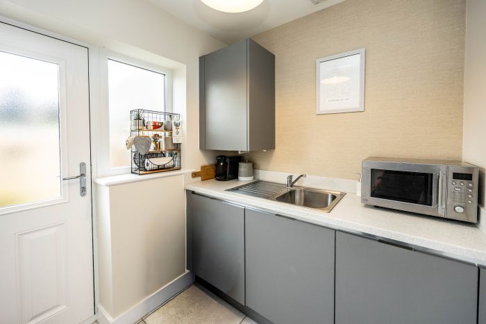 Utility Room 2.17m x 2.15m – Well-appointed laundry room featuring a convenient sink, coordinated wall and base units, and an integrated washing machine. This practical space offers direct access to the rear garden, perfect for managing messy play, outdoor activities, or pet cleaning after a walk.